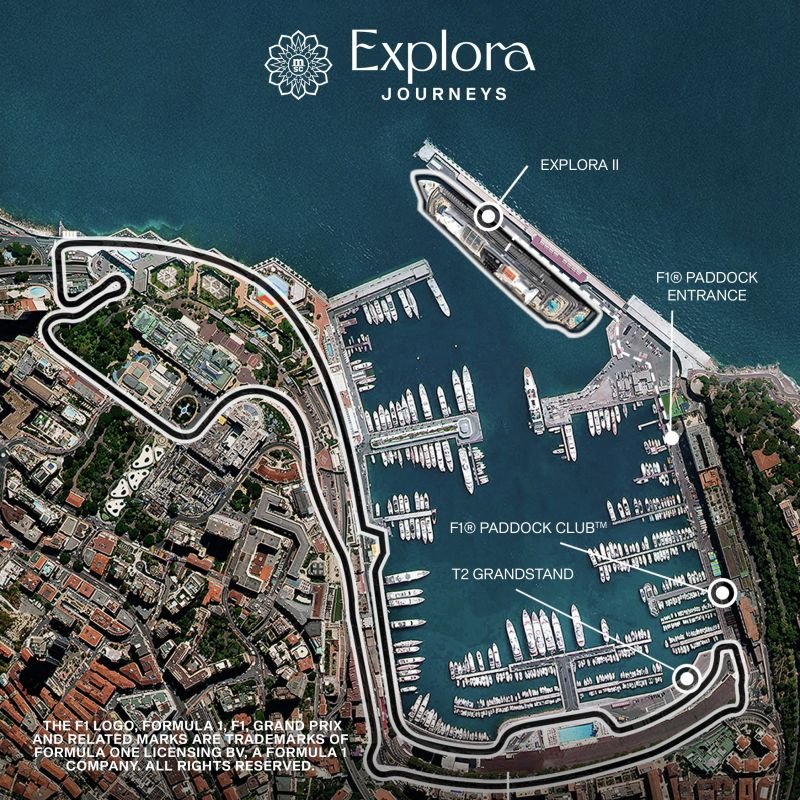EXPLORA Journeys ficará ancorada no Port Hercule em Mônaco durante o F1 Grand Prix, servindo como hotel boutique flutuante de luxo a poucos metros da pista. Os hóspedes podem assistir ao GP, com serviços exclusivos.